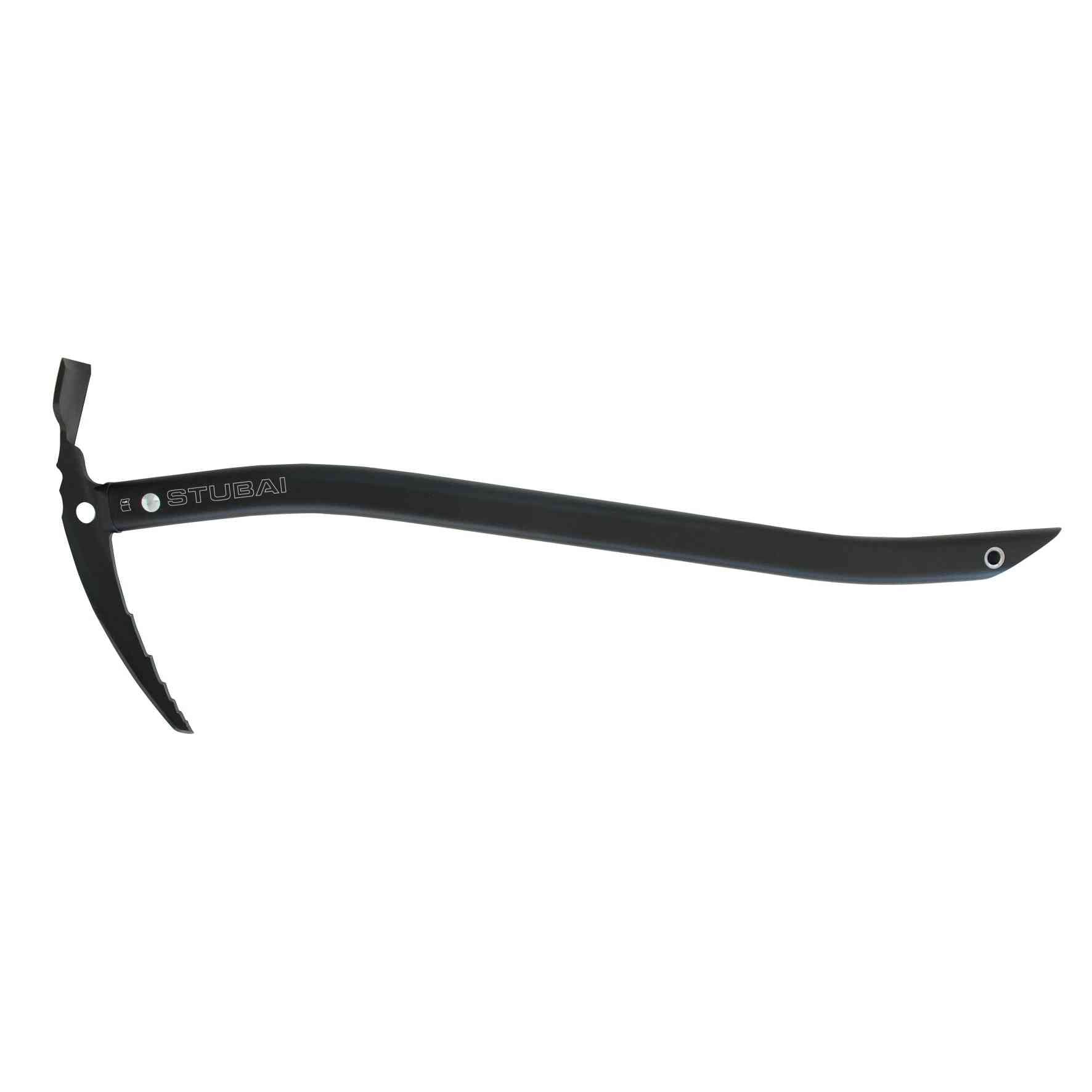 LEVEL isyxa är böjd så att spetsen hamnar direkt under handen vid gång—övre böjen skyddar handen och minskar snökontakt i brant terräng, medan undre böjen ger bättre kontroll på platt mark. Hela ytan är matt svart: aluminium-skaft och stålhuvud, sandblästrade och lasergraverade. En ihålig nita i skaftänden möjliggör fäste för handledsrem (säljs separat). Certifierad enligt EN 13089 Typ 1, vikt 490 g, längd 590 mm.