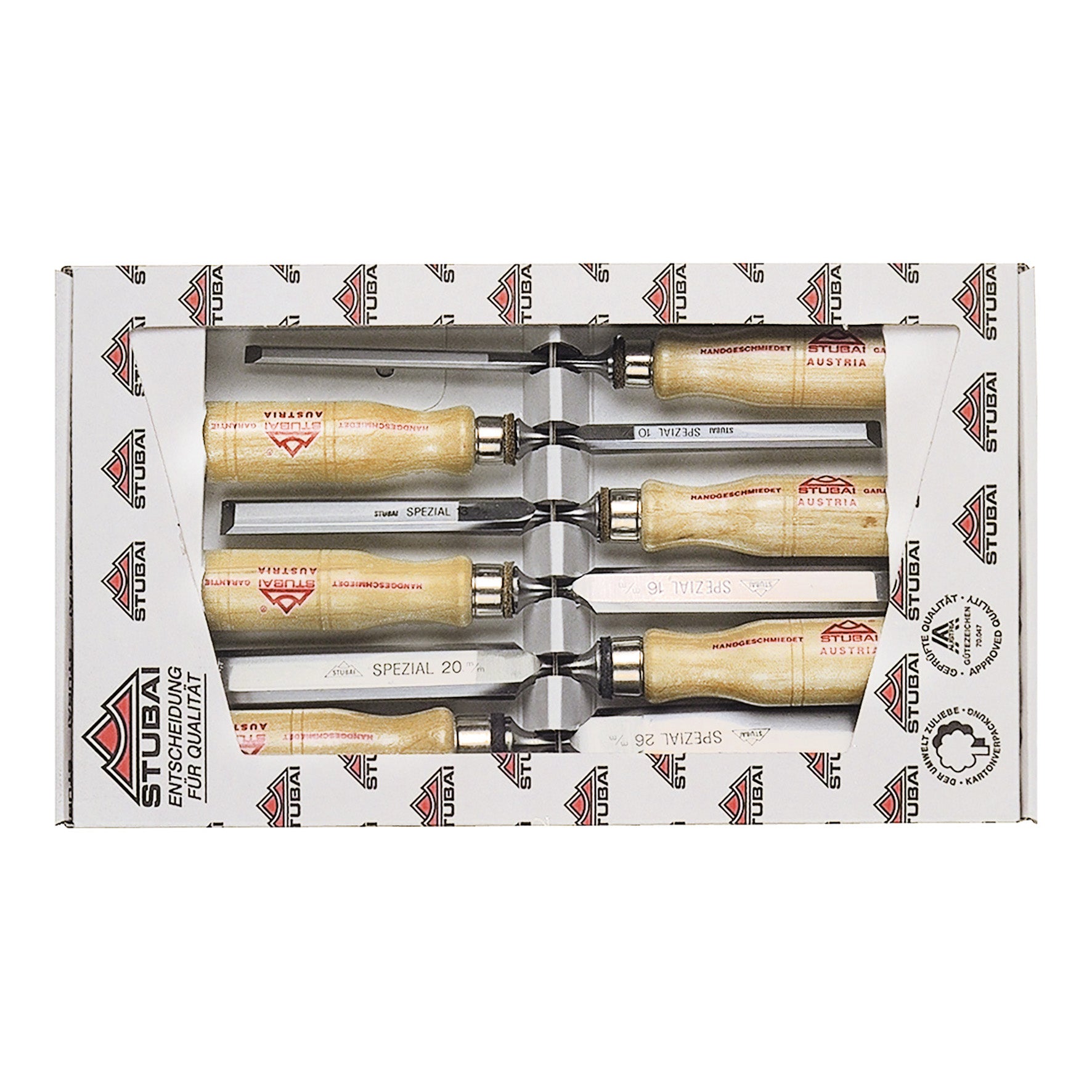 Stämjärnen i setet har bladbredd: 6 mm, 10 mm, 26 mm, 13 mm, 16 mm, 20 mm