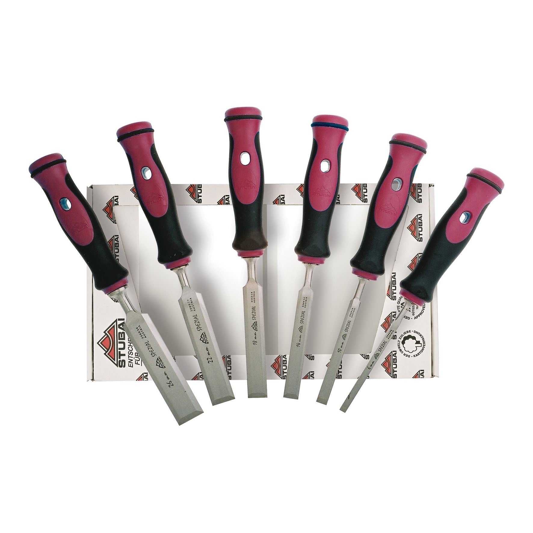 Setet innehåller stämjärn med bladbredd 6 mm, 10 mm, 14 mm, 18 mm, 22 mm och 26 mm.