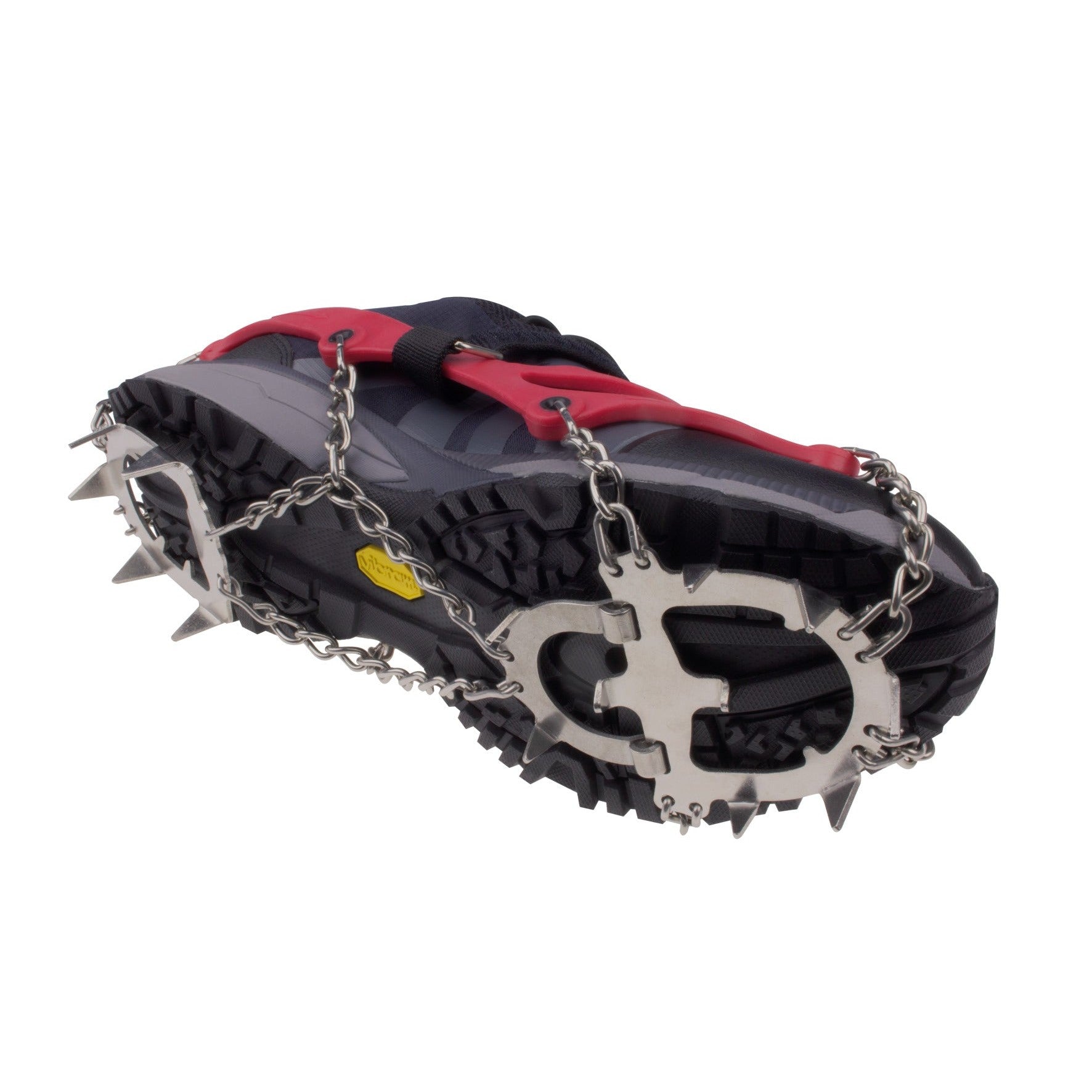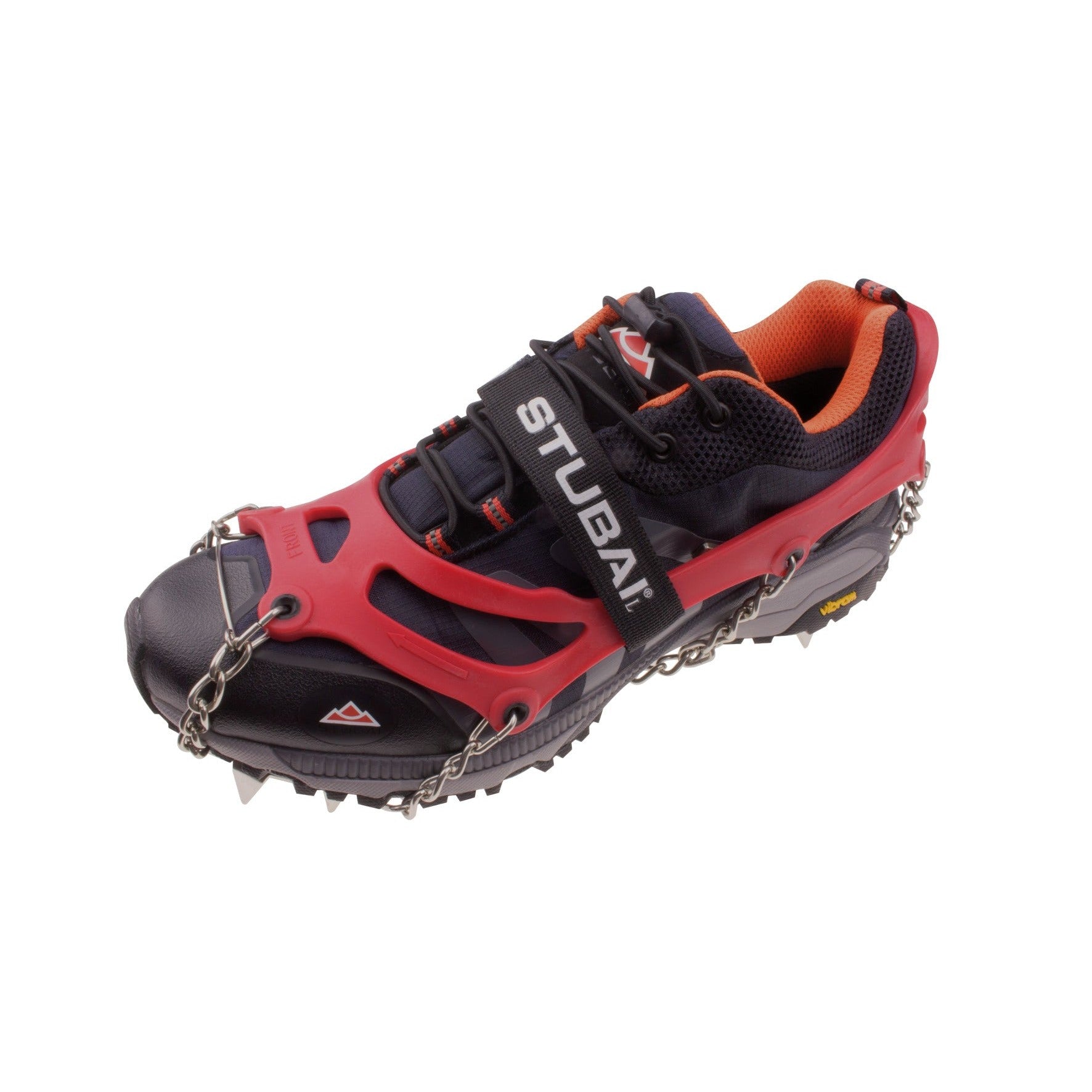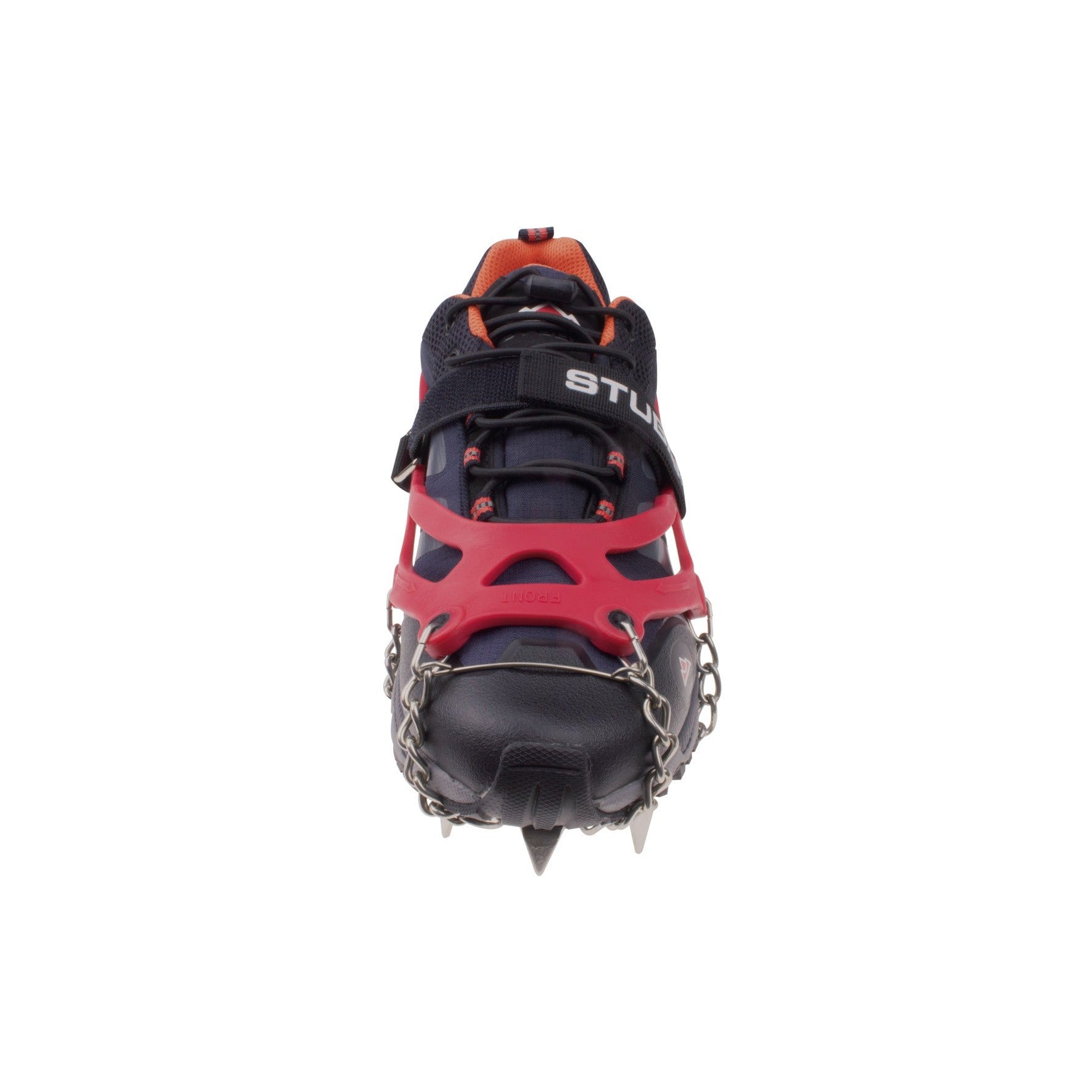 Med Stubai’s Mount Track-stegjärn får du pålitligt grepp på snö och is utan att kompromissa med enkelhet och komfort. De elastiska stegjärnen träs smidigt över dina skor och fästs med ett justerbart spänne. Under sulan sitter en rostfri stålkedja tillsammans med en specialutbildad, varmförädlad stålkonstruktion (hästskomönster med 14 taggar) för stabilt fäste på alla underlag.
