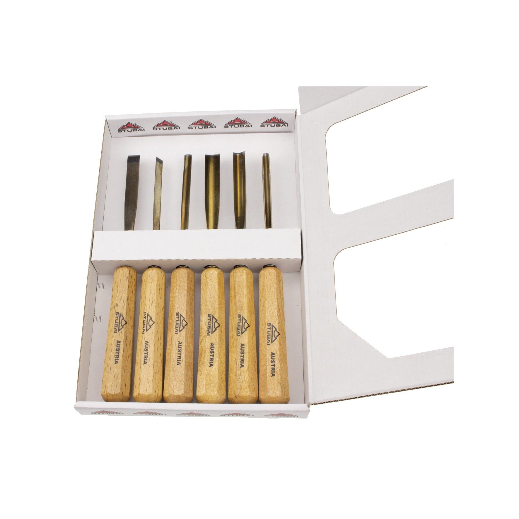 STUBAI 5101 är ett komplett startset med sex högkvalitativa stämjärn för träsnideri. Verktygen levereras i en praktisk kartongförpackning och är ett utmärkt val både för nybörjare och erfarna träskulptörer.
